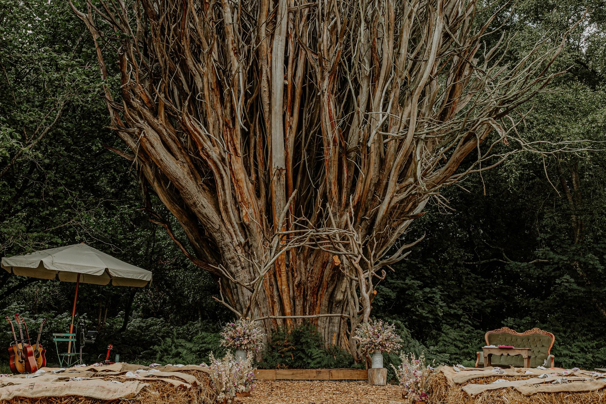 We offer two main and distinct event spaces, one being the Woodland Dining space and the other our ceremony area nestled beneath our stunning Cedar tree . These can be booked separately or together along with our boutique camping space if you require any accommodation. Rest assured though, irrespective of what spaces you book you and your guests will be the only people on site, we never book the two spaces at the same time unless exclusively.